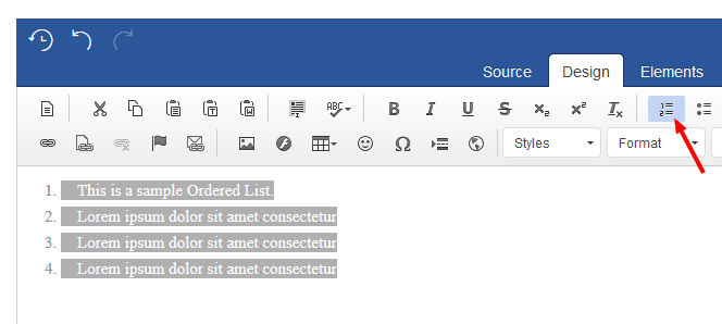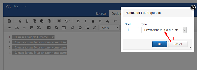 You can do this, by selecting your text in the editing area and then select the 'Number List' button from the editor as seen below: