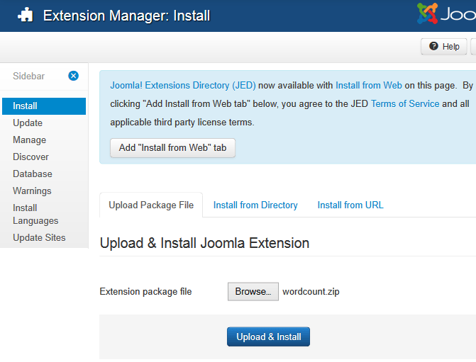 Under `Upload Package File’ click on `Browse...’, select the ‘wordcount’ Zip file and click on `Upload & Install’.